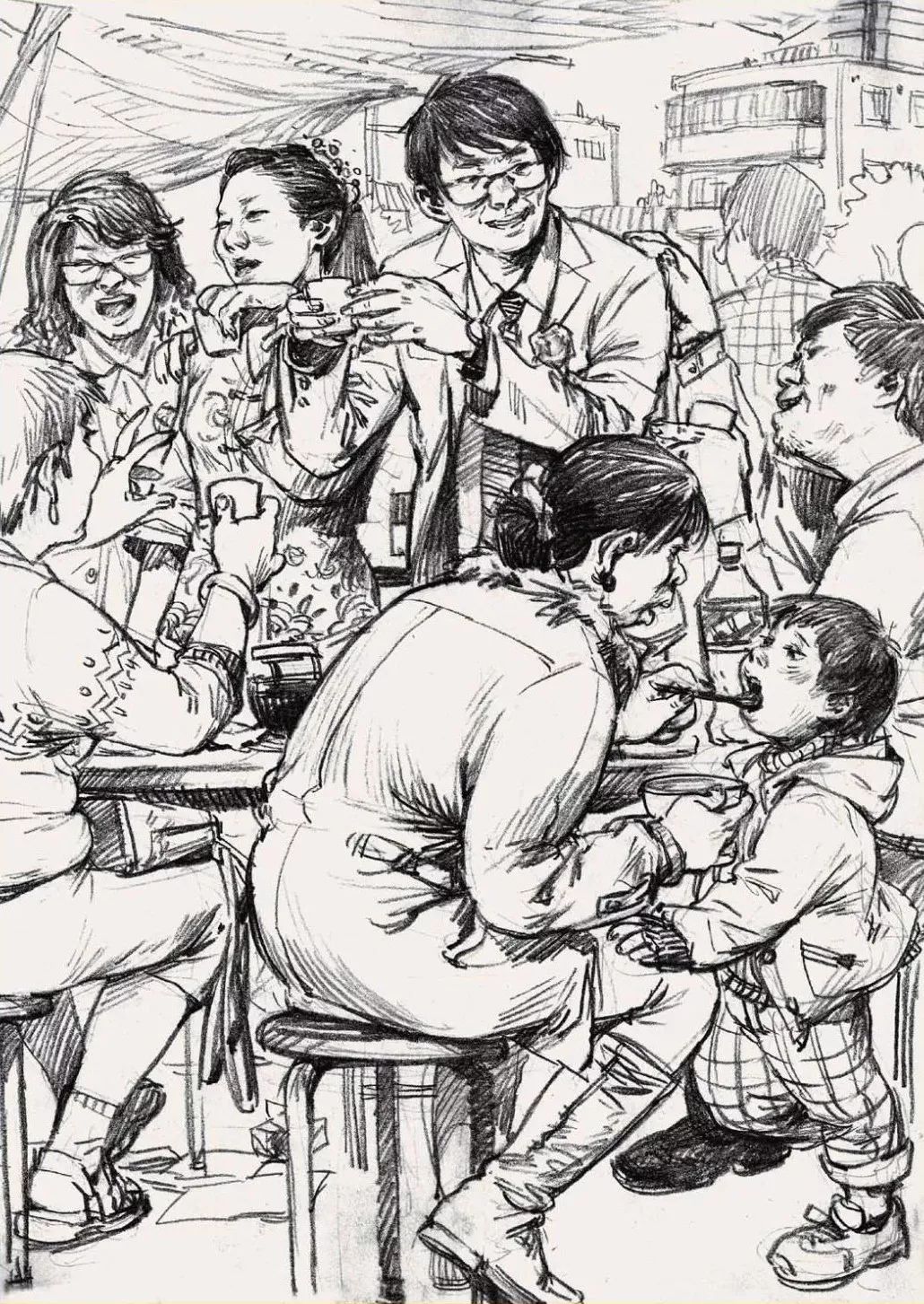 场景速写的最终效果一定要非常贴近生活,不管你说俗气也好,不大气也好,最贴近生活的一定是好的作品。下面这张作品画的是结婚的场景,新郎和新娘在饭桌前敬酒,画面中的每一个人表情都不一样,新娘和她的闺蜜笑开了花,右边的中年人已经喝醉了,最前面的大妈在喂小孩吃饭,而新郎的表情是开心中带着一点无奈,这种场景非常生动、自然,仿佛自己就置身其中。